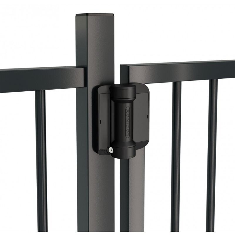 Charnières à ressort pour portillon de jardin d'un poids maximal de 75 kg et 1,3 mètres de largeur. Tige filetée de 150 mm. Pour profil carré de 40 mm. La force de fermeture est facilement réglable à l’extérieur avec une clé Allen. Prix à la paire.