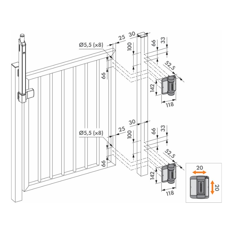 Charnière galvanisé à chaud avec réglage en 4 dimensions. La profondeur, la hauteur et l’espacement entre le poteau et le portail sont réglables après installation. Pièces à souder : en acier électrozingué. Tige filetée = 110 mm.