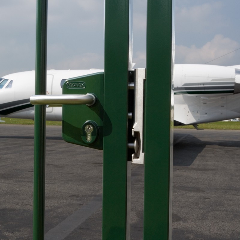 Serrure de type industriel pour portail battant avec coffre de couleur vert et mécanisme en acier inoxydable. Nous conseillons cette serrure comme un standard pour toutes vos portes industrielles. Se monte en applique sur un tube de 40 à50 mm.
