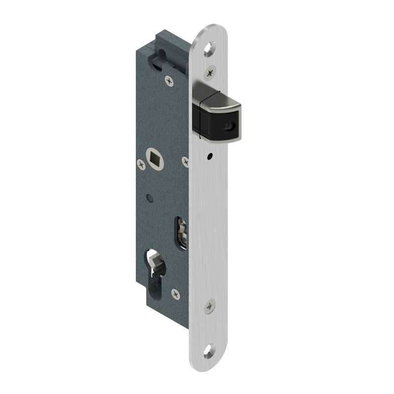 Serrure en retrait, en inox, réversible, destinée au portail aluminium/bois/PVC/acier, avec un pêne rentrant. Axe à 69 mm et fouilllot de 7mm. Elle se compose d'un boîtier de serrure en composite et d'une têtière carré en inox. Pour cadre de 40x40mm.